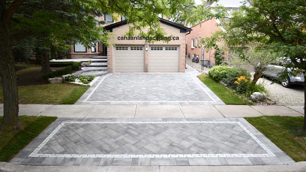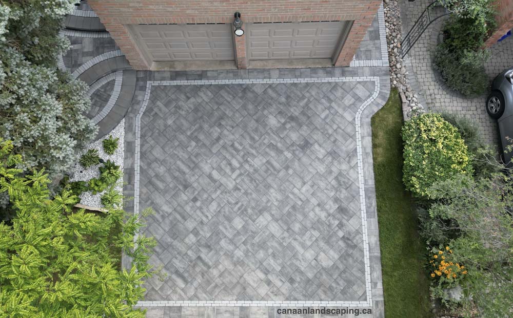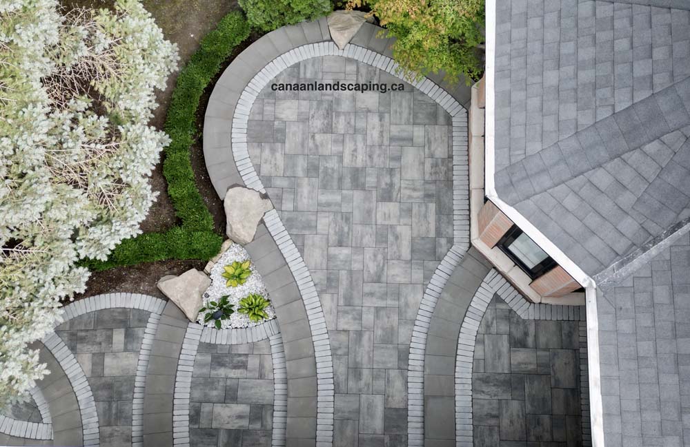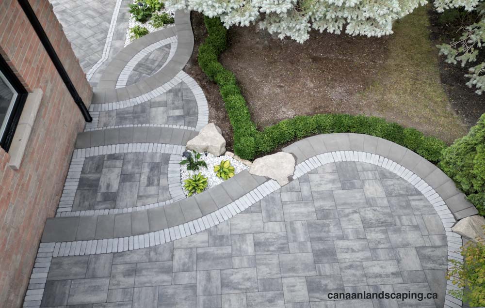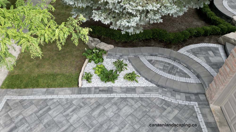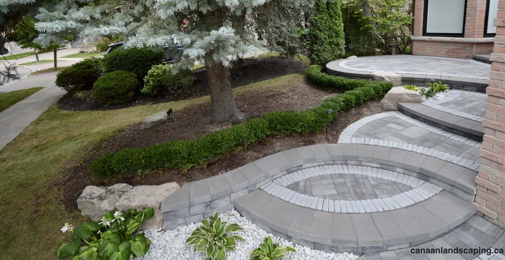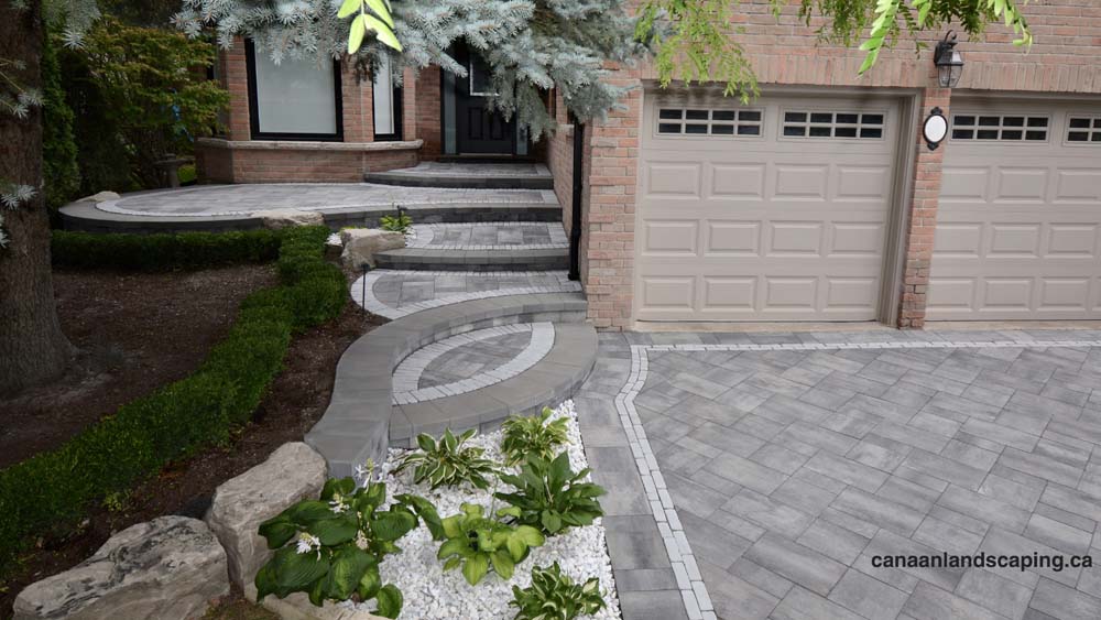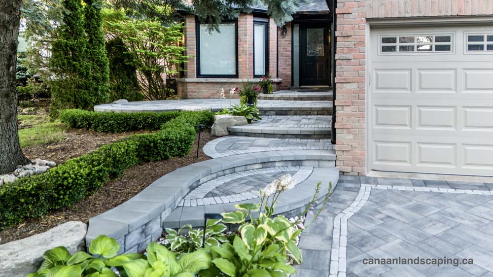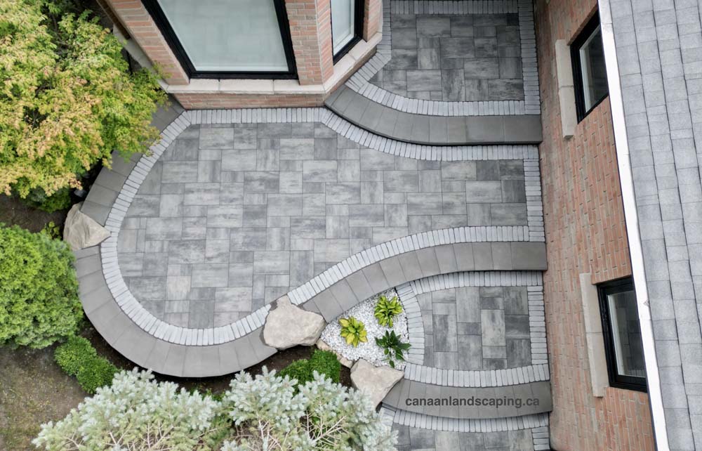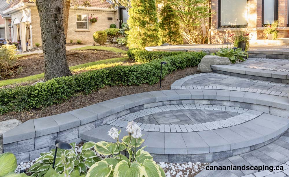 Pavers:Northshore (Granite Mist) with Copthorne (Arctic Grey) Retaining Wall : U-Cara (Granite Mist) Steps: U-Cara (Granite Mist)