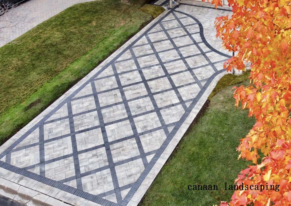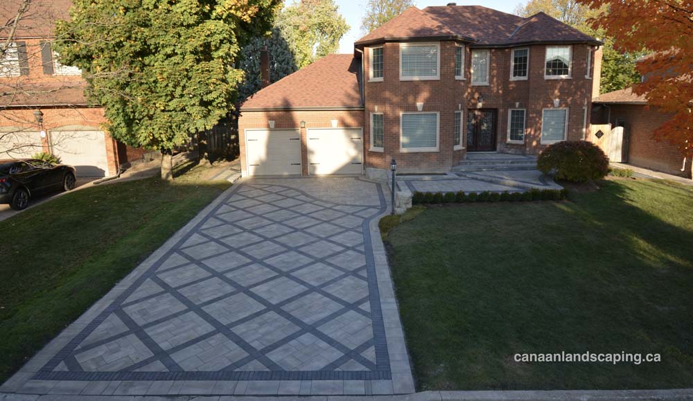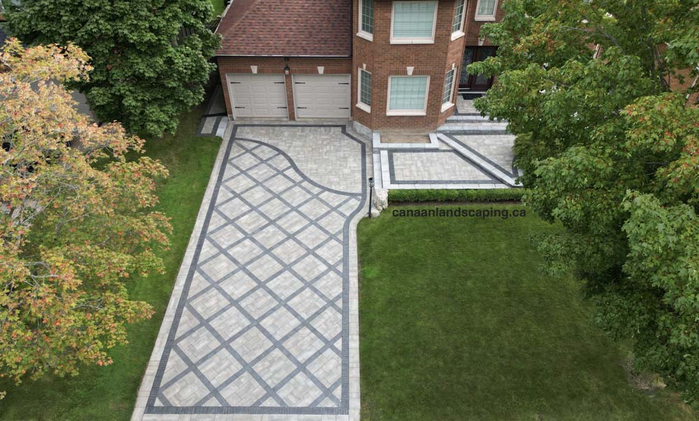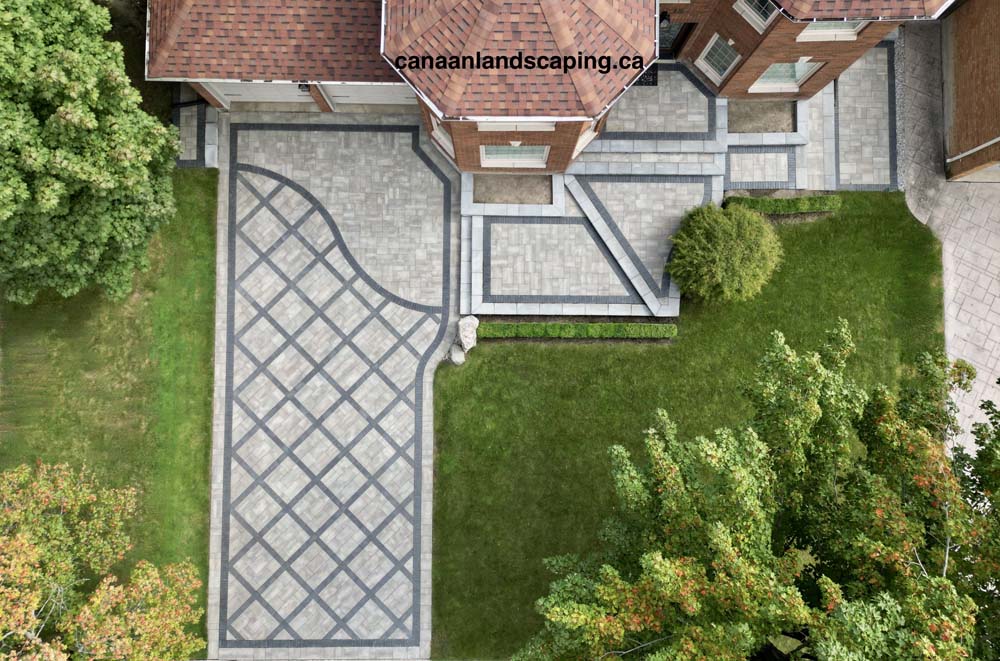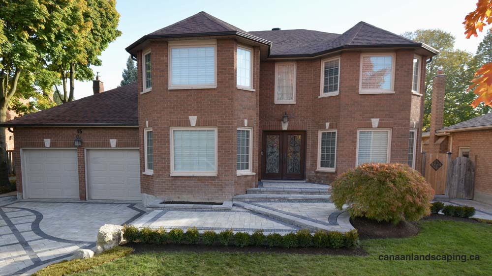 Located in Vaughan : Pavers:Northshore (Fossil )with Copthorne (Basalt ) and Northshore (Midnight Charcoal ) Steps & Retaining Walls: Ortana (Greyfield)